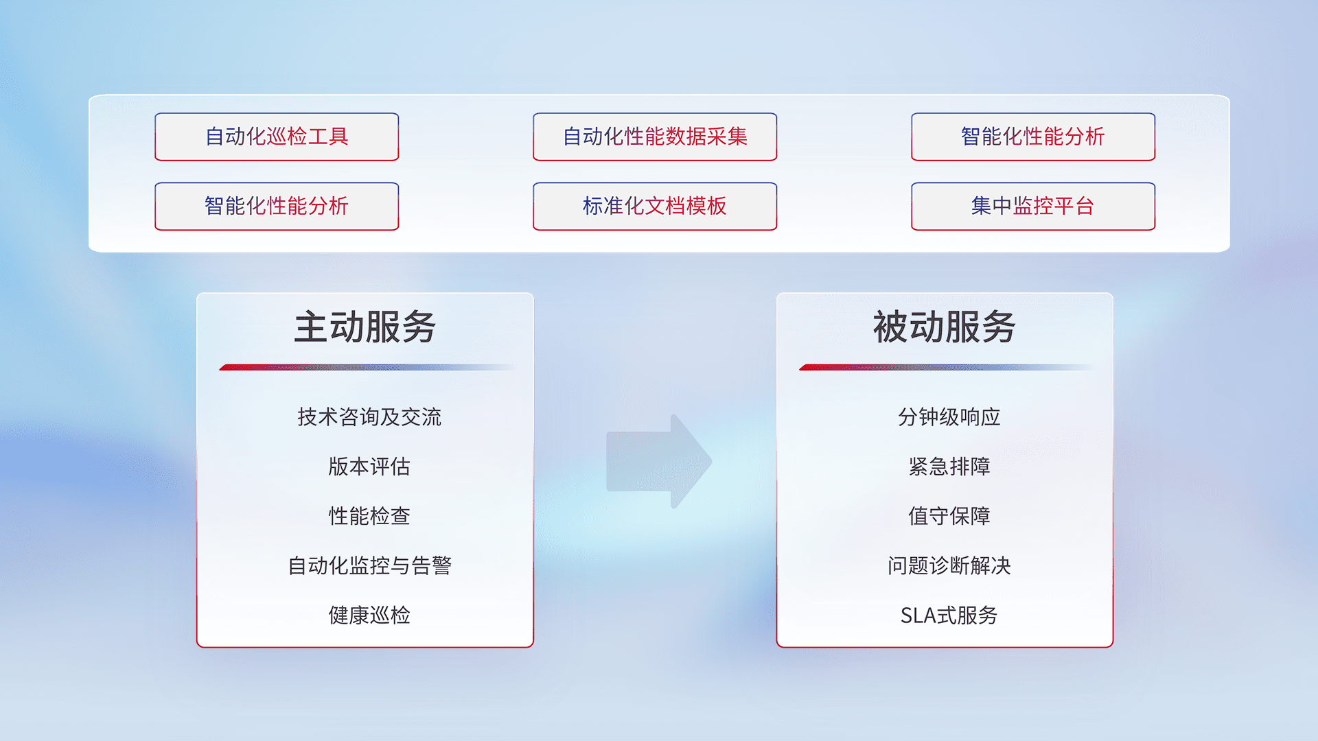 智能化工具和标准化文档,,,保障服务质量,,提供主动服务(包含技术咨询、、、版本评估、、、、性能检查、、、、自动化监控与告警、、、健康巡检)和被动服务包含(分钟级响应、、紧急排障、、值守保障、、、问题诊断解决、、SLA服务)。。。。
